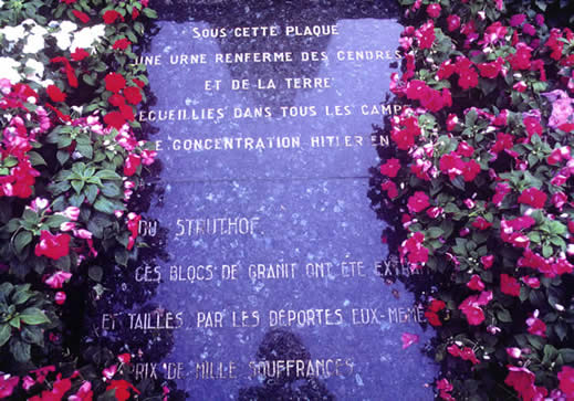 Left, Marlot speaking to school group at Natzweiler, 1991. Right, he and his wife in the park in Dijon where he had a monument erected to the memory of the visctims of the camps. The inscription reads: "Under this plaque an urn encloses ashes and earth collected from all of Hitler's concentration camps. From the Struthof, these granite blocks were extracted and cut by the prisoners themselves at the cost of a thousand sufferings."