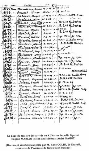 L'Enfer d'Alsace original publication and the camp register with Marlot's prisoner number, birth date and date of transfer to Dachau
