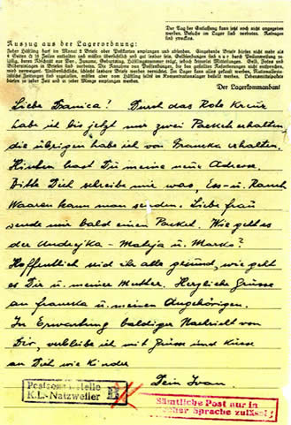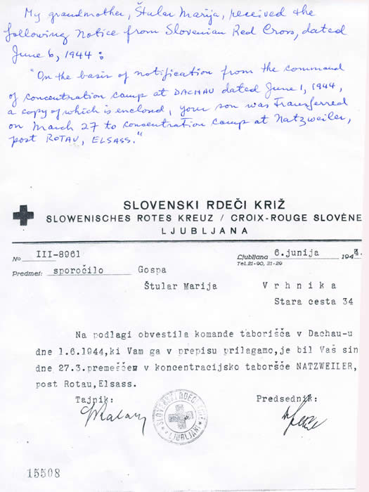 "I am enclosing two of my father's letters from Natzweiler to my aunt in present day Kamnik in Slovenija known as Stein in Oberkrain during the German occupation. His letters from Dachau were also mailed to my aunt Franciska Levstek who later forwarded them to my mother Danica Stular in Vrhnika through some underground connection. These letters had to be written in German and were censored by the camp command before they were forwarded.