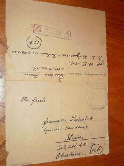 "The last two lines [above] written by my aunt Franziska Levstek: 'Arrived on Saturday, June 10, 1944. I had already sent 2 parcels to KL on June 5, 1944.'"My aunt's last name is Levstek; however, I notice that my father spelled it Leustek. Her first name is Frances or Francka in Slovenian or Franziska in letters."