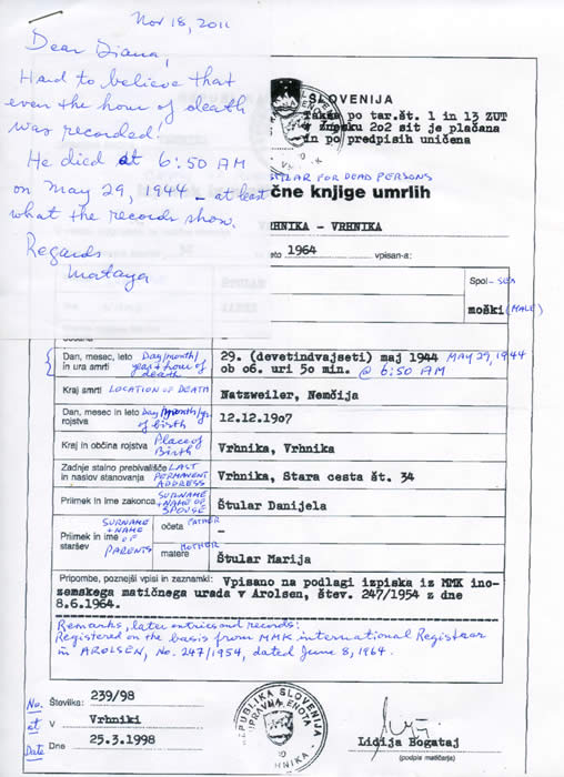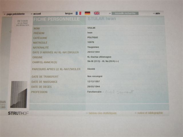 "My father, Ivan Stular, prisoner #: 60974 died in Natzweiler in 1944..... Ivan and/or Janez means John in Slovenian.