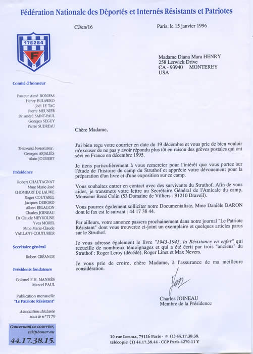 "Most of all, Ms. Henry has keyed into the most important aspects of the camp. She is especially fascinated by the fact that this was a major incarceration center for captured members of the French underground and other anti-Nazi political movements in Western Europe. Tracking the fates of these prisoners and interviewing the survivors will create an important window on the still too sketchy history of the resistance."