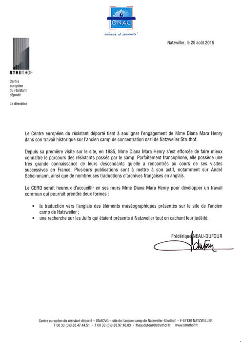 "I am pleased to have the opportunity to endorse, without reservation and with much enthusiasm, Ms. Diana Henry and her research project on the Nazi Concentration Camp, Natzweiler-Struthof...Her work when complete will be a particularly important addition to the literature of the Holocaust, raising questions uniquely suited to this particular camp. ...She is asking the right questions of her material, including some new and important ones...Considering the construction of a historical web site ( something that a great many of the camps already have, much to the benefit of scholarship...I see her photographic eye of enormous benefit....