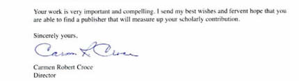 "Your work is very important and compelling. I send my best wishes and fervent hope that you are able to find a publisher that will measure up your scholarly contribution.