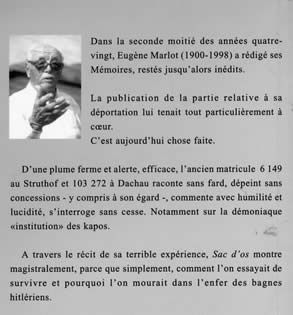 The book, Sac d'os, by Eugene Marlot, from which the chapters on the Natzweiler-Struthof concentration camp were excerpted to form the book L'enfer d'Alsace.Back cover photo by DMH. |