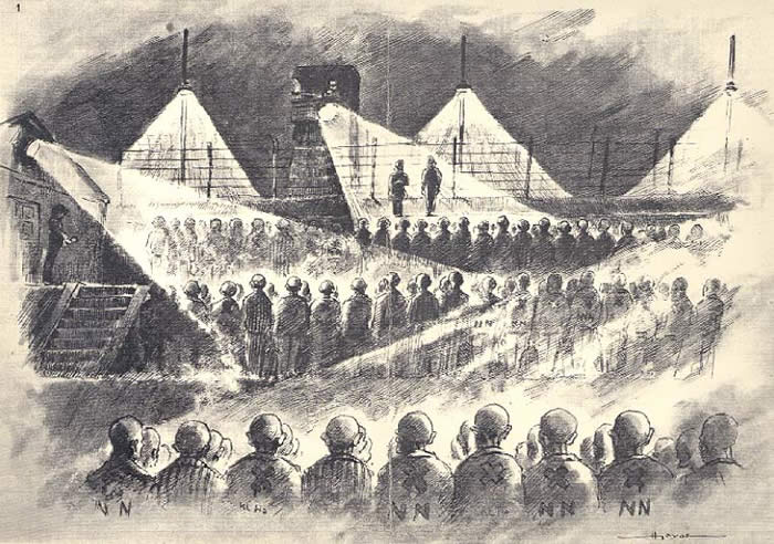to stand for hours while punishments were meted out. In the drawing foreground are represented NN prisoners with X's on the back of their jackets.