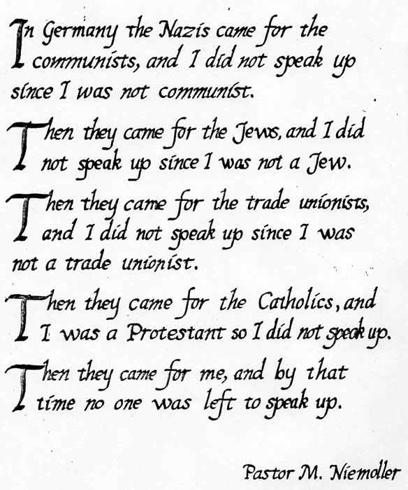 (Many versions of the Niemoller statement exist; his authorship is disputed but the sentiment remains.)