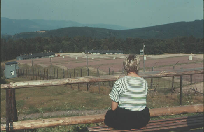 Seated at the edge of the plaza just outside the gates of Natzweiler-Struthof, a visitor looks across the double