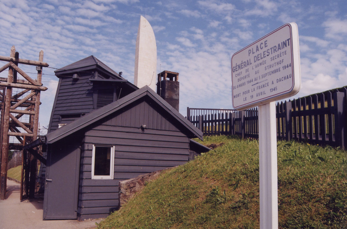 The sign posted by the entrance to the camp reads: "General Delestraint Square. Head of the secret army, imprisoned at the Struthof from the 8th of March to the 5th of September, 1944. Died for France at Dachau, April 19, 1945." Delestraint, general in charge of the resistance movements within France during the German occupation, was removed from Natzweiler with all the other prisoners, in advance of the oncoming American troops, who discovered the camp, empty of prisoners, in November of 1944. He was shot just before the Americans liberated Dachau.Photo and text Copyright © Diana Mara Henry.